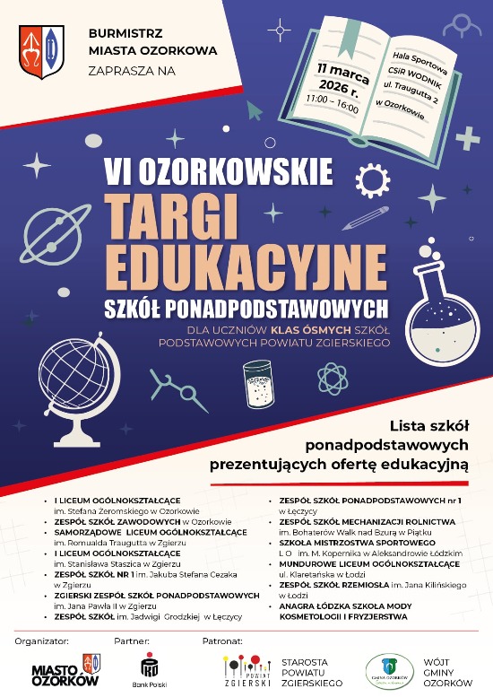 Powiat Zgierski i Miasto Ozorków zpraszają rodziców oraz uczniów ósmych klas szkół podstawowych na VI Ozorkowskie Targi Edukacyjne, które odbędą się 11 marca br., w godzinach 11:00–16:00 w hali sportowej przy ul. Traugutta 2 w Ozorków. Targi to doskonała okazja, aby w jednym miejscu zapoznać się z ofertą edukacyjną szkół ponadpodstawowych, w tym szkół powiatowych – naszych lokalnych placówek, które zaprezentują swoje kierunki kształcenia, profile klas oraz możliwości rozwoju.