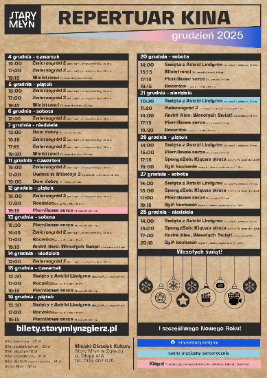 Oto ostatni w 2025 r., grudniowy rozkład filmowych projekcji w Starym Młynie, w Zgierzu.
