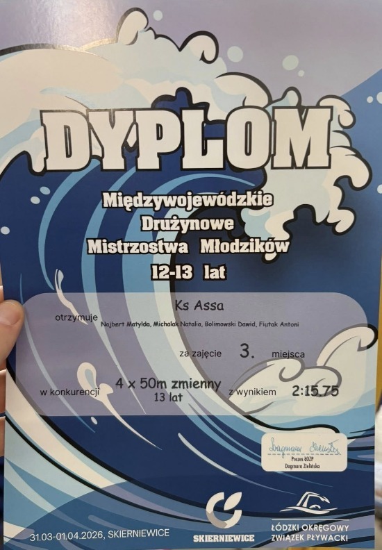 Podczas Międzywojewódzkich Drużynowych Mistrzostw Młodzików (31.03–1.04.2026) w Skierniewicach odbyło się uroczyste wręczenie certyfikatów powołania do kadry wojewódzkiej młodzików. Nominację otrzymali zawodnicy ASSA: Natalia Michalak, Dawid Bolimowski, Marcelina i Matylda Najbert.