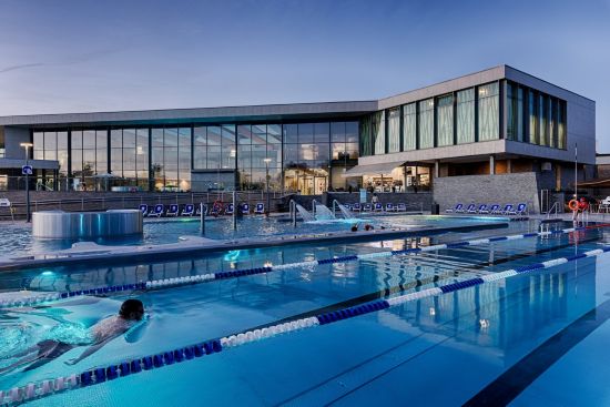 - basen pływacko-rekreacyjny o powierzchni ponad 1000 m², z trzema torami o długości 50 m, temperaturą wody 32–34°C oraz strefą masażu,